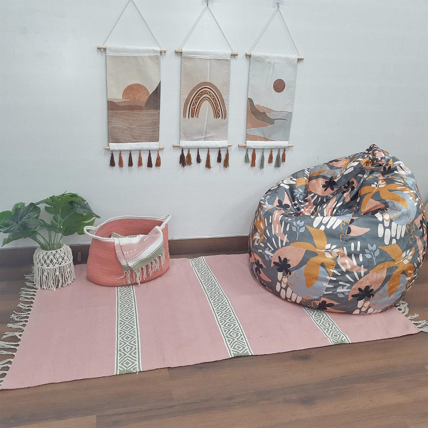 Avioni 100% Cotton Handloom Floor Rug / Durrie – Neohome Collection – Green stripes on pink background