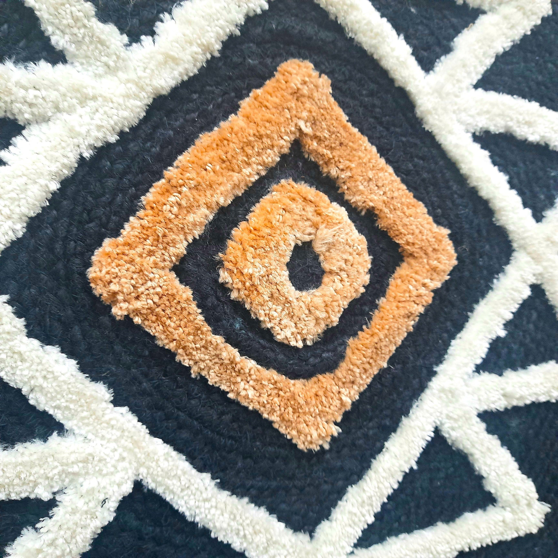 Embrace the Boho aesthetic with the intricate detailing and earthy tones that characterize this unique piece. The black base serves as a bold canvas, accentuated by delicate white and beige overtufting, creating a harmonious visual impact.