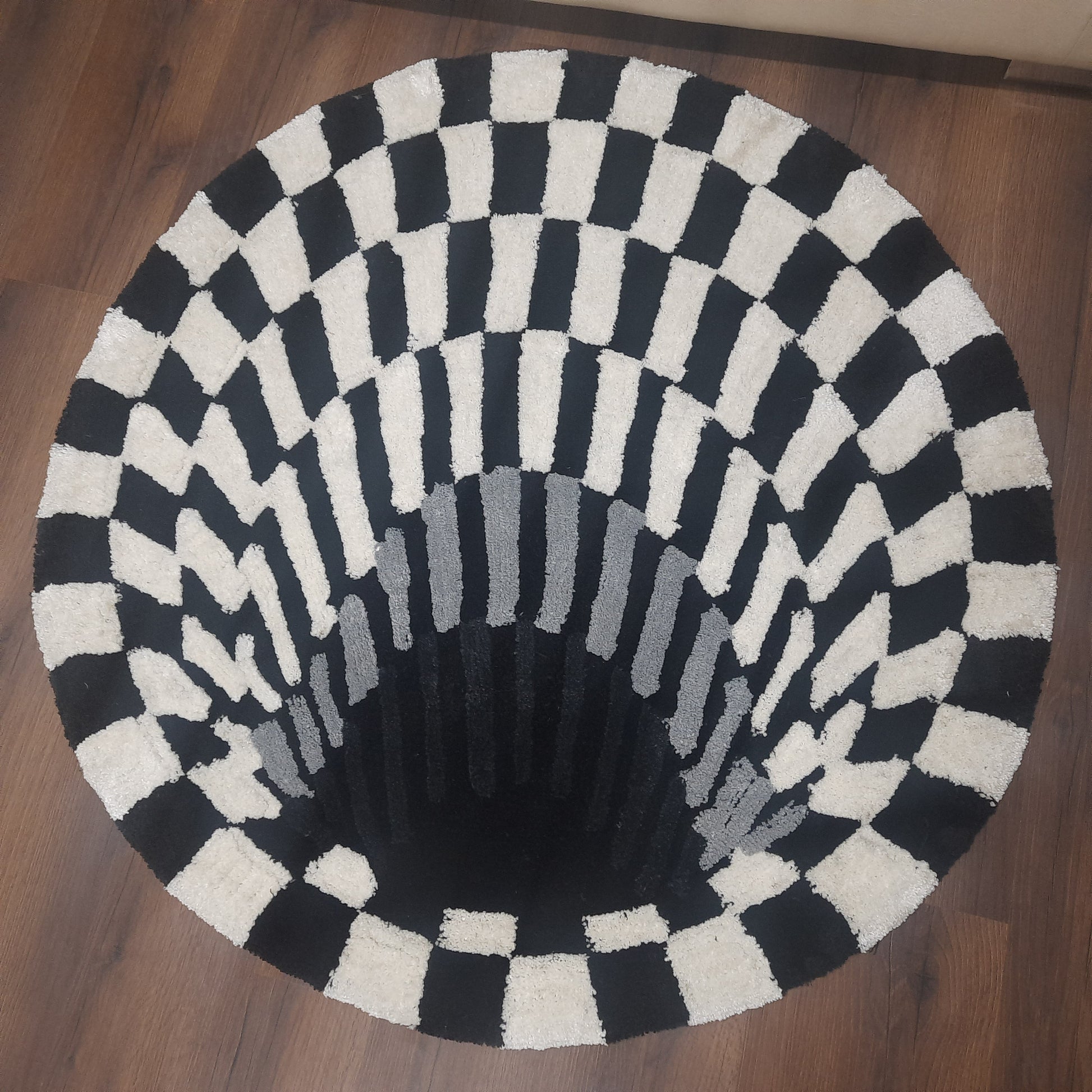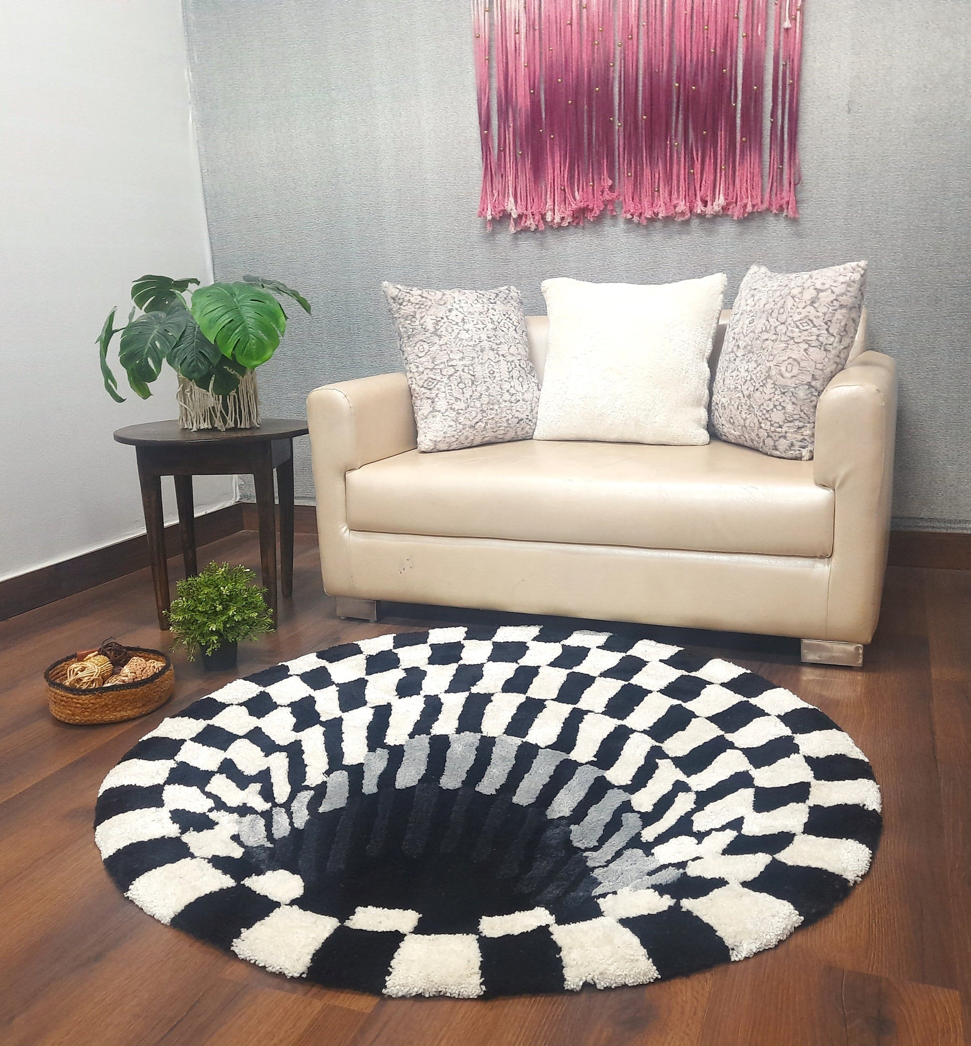 Avioni Home Vortex 3D Illusion Soft Plush Micro Yarn Round Carpet In Black & White| Soft, Non-Slip, Easy to Clean