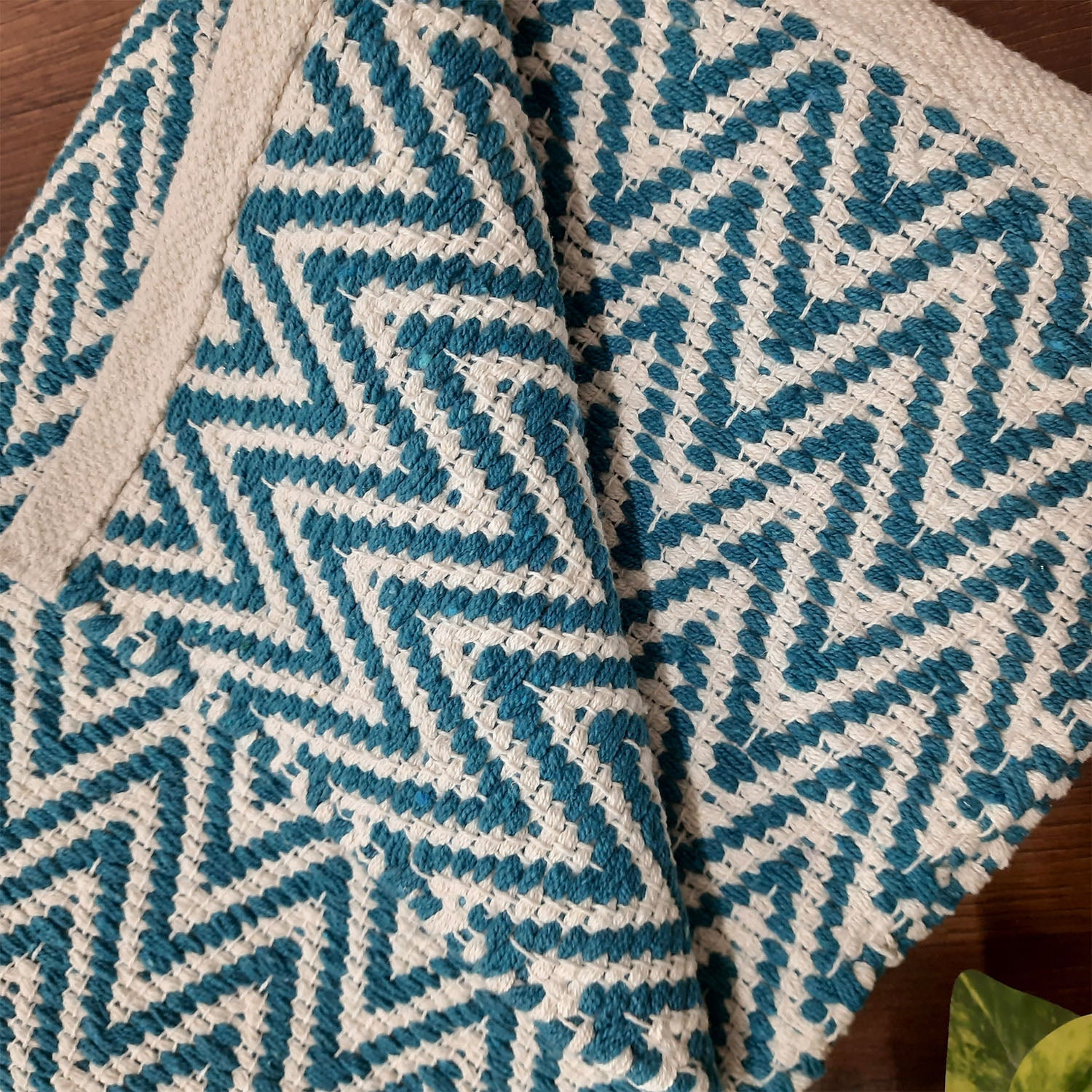 Avioni Chenille handloom blue white herringbone design durrie is a must-have for anyone looking to add a touch of elegance and comfort to their home. With their soft texture, stunning design, and high durability, they are sure to become a favorite in your household.