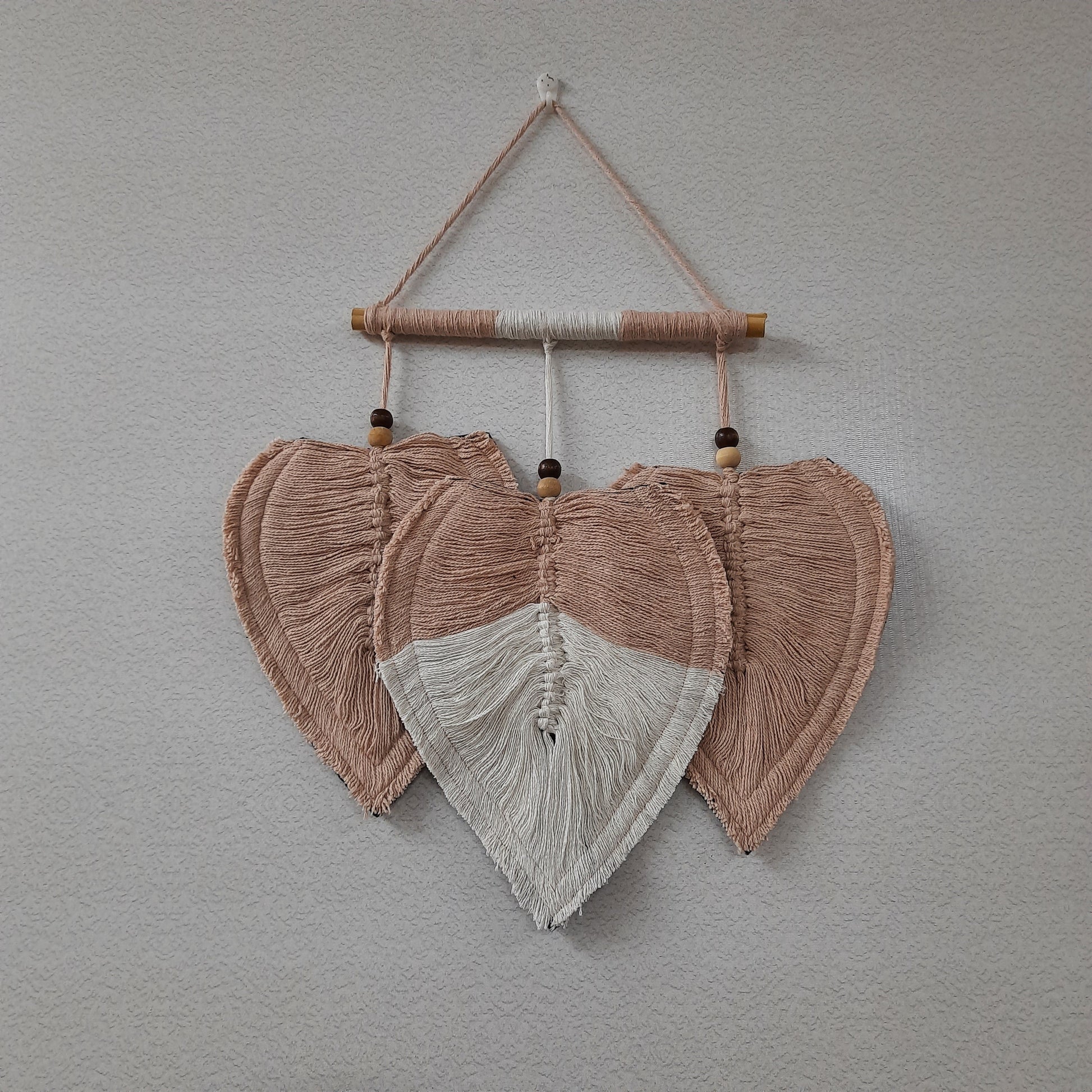 Avioni Feather Macrame Wall Hanging With Beads, Macrame Knotted Wall Tapestry, Living Room Bedroom Interior Decor-Peach And White-38 cms x 27 cms