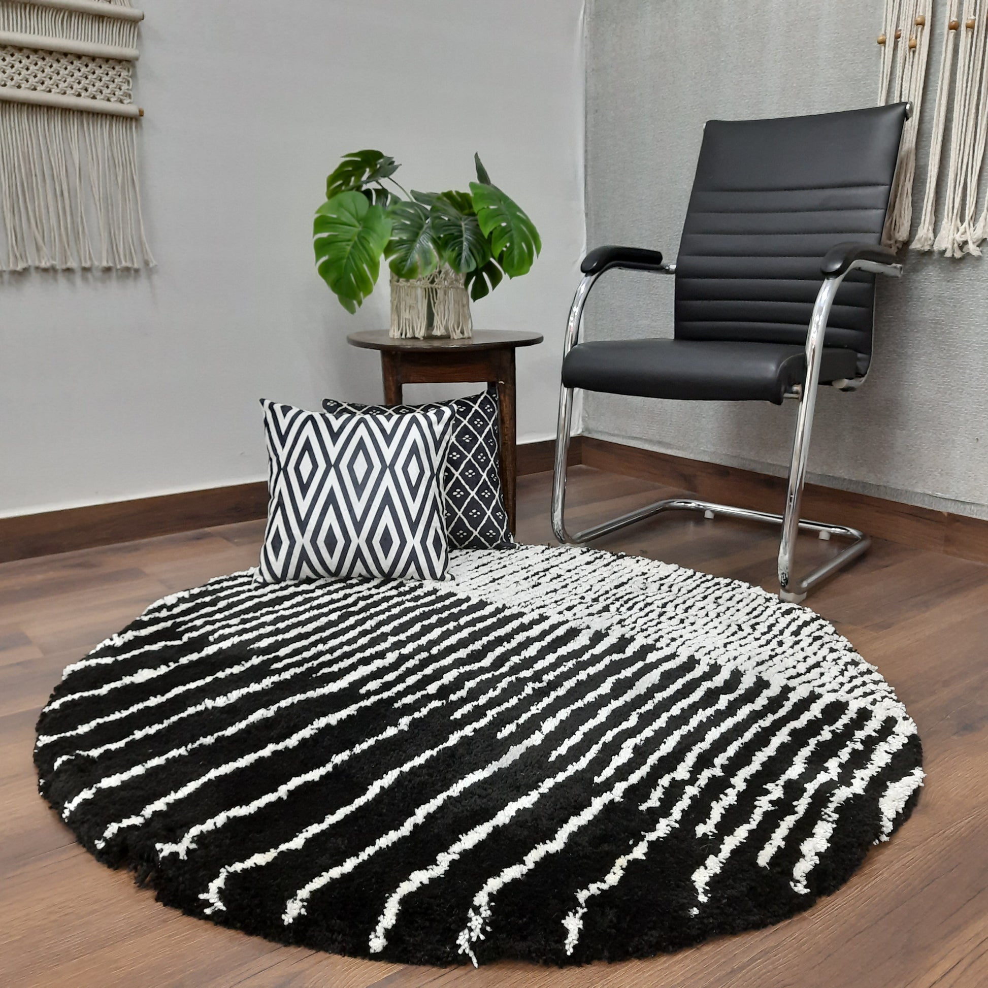 Avioni Home Atlas Collection - Moroccan Style Microfiber Round Carpet In White & Black| Soft, Non-Slip, Easy to Clean
