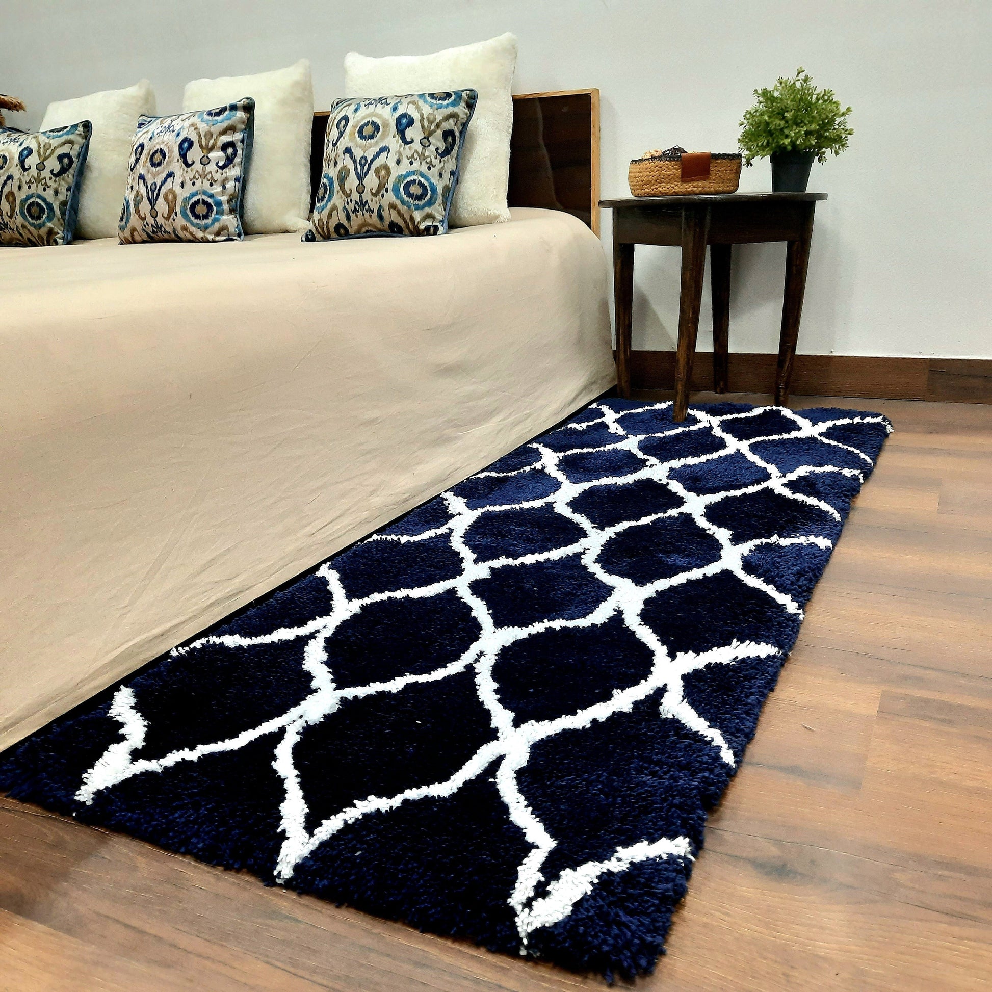 Plush Soft Washable Shaggy Navy Blue Carpet With White Moroccan Design /Bedside Runners by Avioni Home