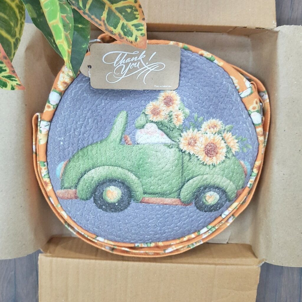 Premium Sling Bag for Women, Avioni Fashion Shoulder Bag, Bohemian Style-Gnome in Car , Braided Sides Round Sling Bag, Perfect For Gifts and Traveling-25 cms Diameter